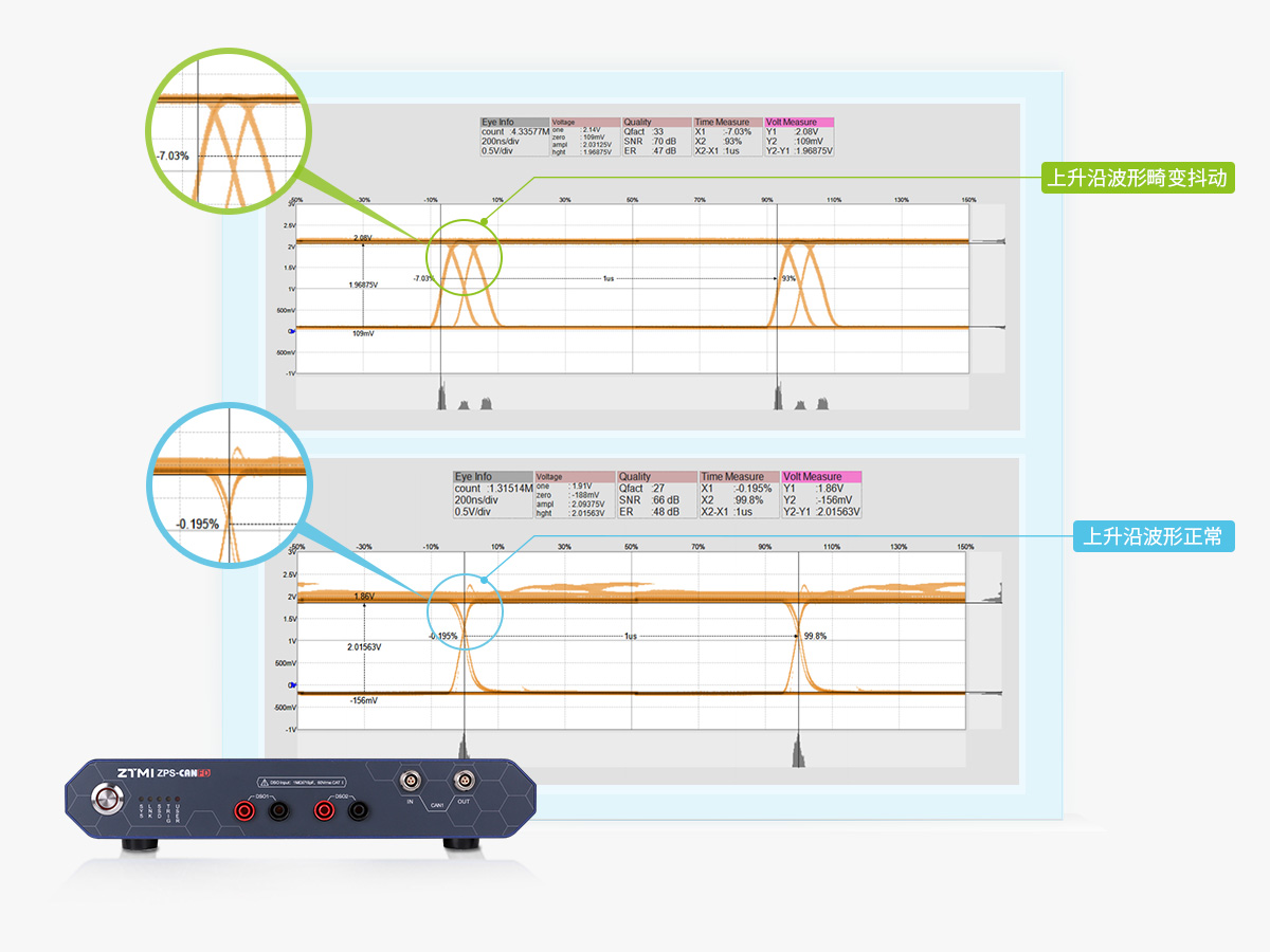 ZPS-CAN FD總線分析儀從幅值、擾動(dòng)和斜率等多種維度參數(shù)進(jìn)行CANFD總線信號(hào)質(zhì)量分析評(píng)估, 可直觀查看總線信號(hào)質(zhì)量情況,規(guī)避信號(hào)傳輸失敗風(fēng)險(xiǎn)。