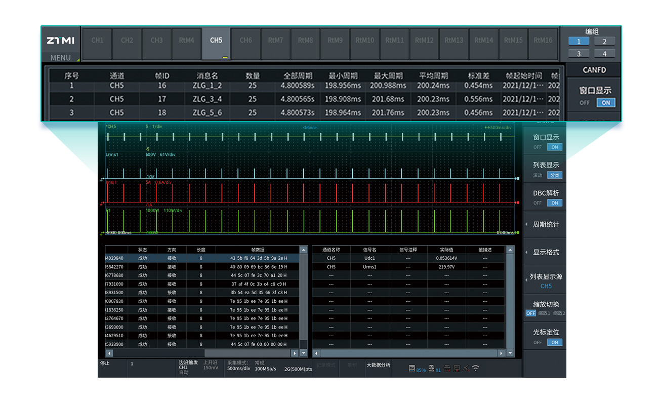 ZDL5000示波記錄儀配合CAN 接口模塊可以實(shí)現(xiàn)對(duì)CAN 信號(hào)的同步測(cè)試,通過加載DBC 文件可以對(duì)新能源汽車的CAN信號(hào)進(jìn)行數(shù)字轉(zhuǎn)化,從而達(dá)到對(duì)CAN報(bào)文統(tǒng)計(jì)分析的能力。