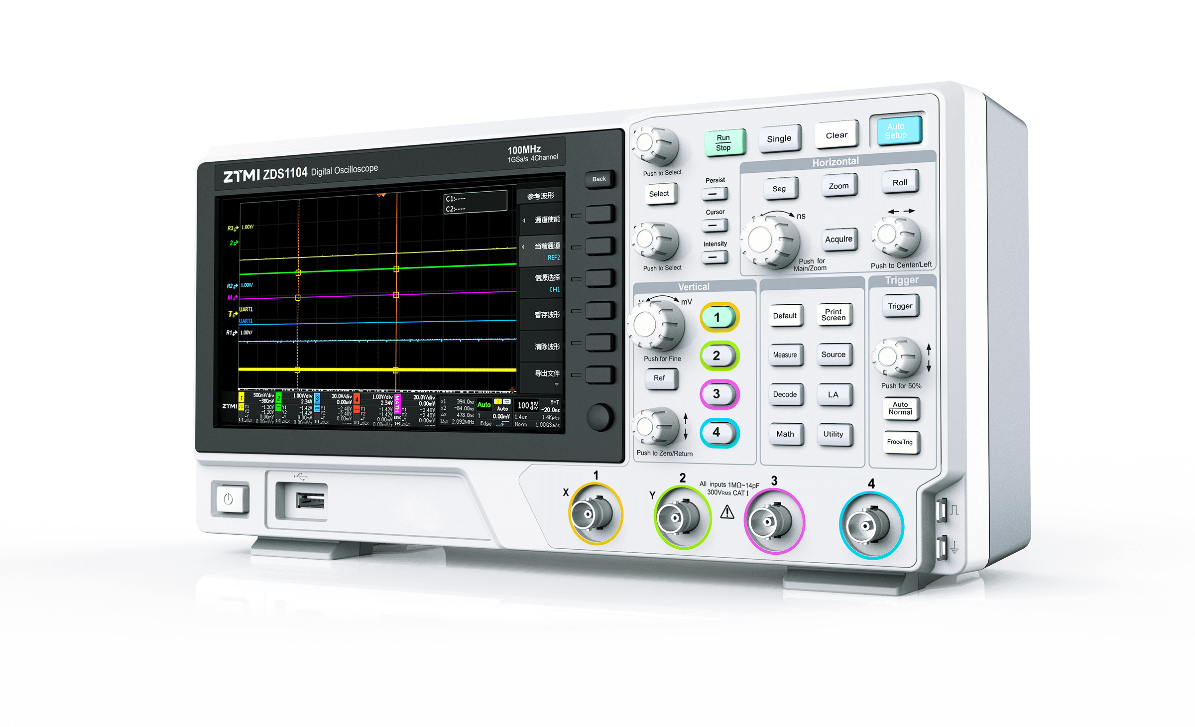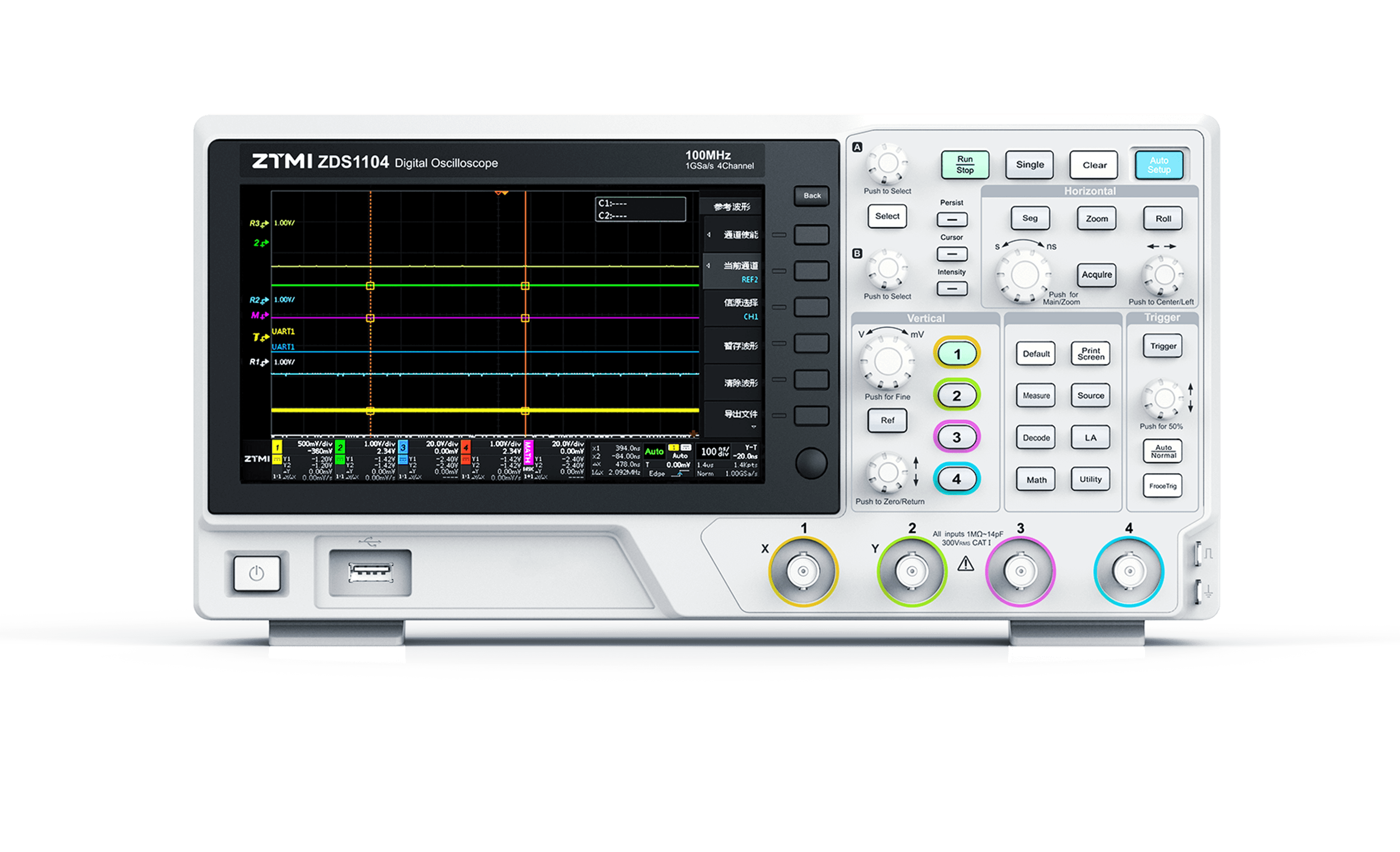 不同于傳統示波器只測一個周期,或通過抽樣減少數據量再測量的模式,ZDS1104示波器通過FPGA全硬件并行處理,基于原始采樣率和28Mpts全存儲深度,對每一幀波形每一周期進行測量統計,測試項目可達50余種,并且支持8種參數同時顯示。