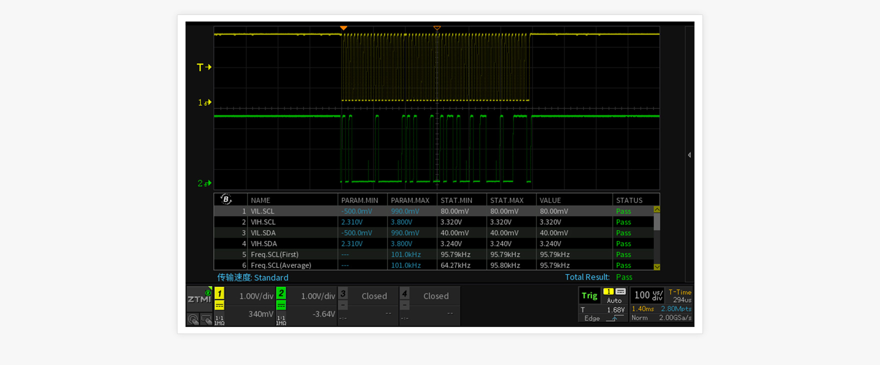 ZDS4000系列示波器免費標配時序分析功能,支持自定義參數配置對I2C、I2S、SPI、MIPI-RFFE、CAN、Reset、Switch進行分析處理。自動分析多個波形中最差情況是否滿足標準,可直接篩選某個特定節點并直接生成附帶截圖的報告。
