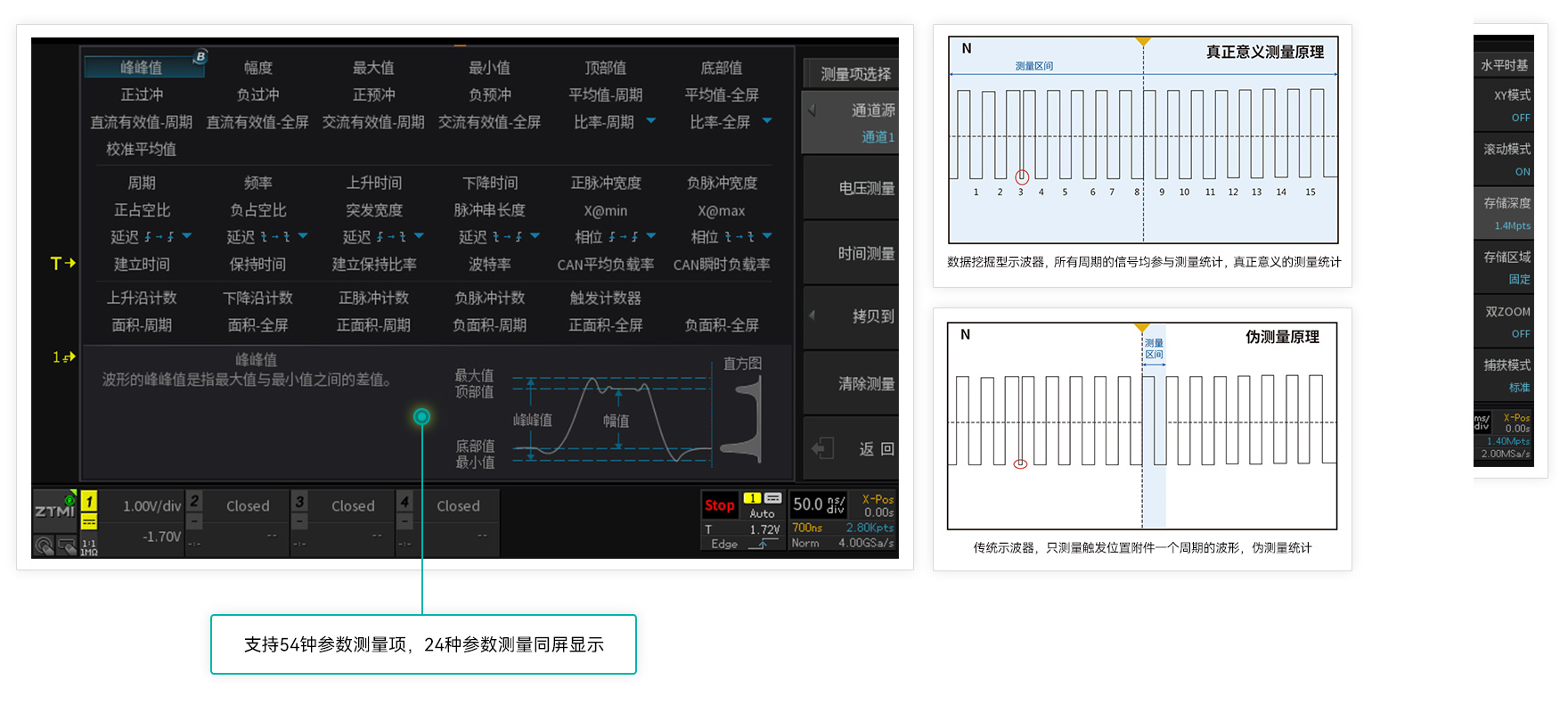 不同于傳統示波器只測一個周期,或通過抽樣減少數據量再測量的模式,ZDS4000系列示波器通過FPGA全硬件并行處理,基于原始采樣率和512Mpts全存儲深度,對每一幀波形每一周期進行測量統計,僅需約1秒即可實現對512Mpts數據的“真正意義”參數測量,測試項目可達50余種,并且支持24種參數同時顯示。這與傳統意義示波器的測量有著本質的區別,也是示波器測試手段與測試方法的突破。