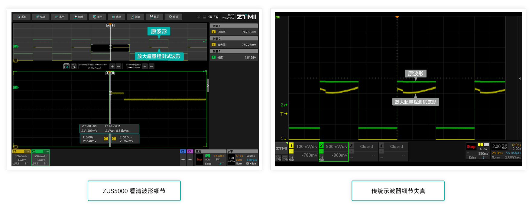 示波器的過飽和恢復時間即示波器的動態范圍能力,直接影響大信號中觀察小信號的準確性和清晰度。ZUS5000示波器具有很快的過飽和恢復時間,結合12bit的高分辨率,可以更好的看清波形中的細節信號。