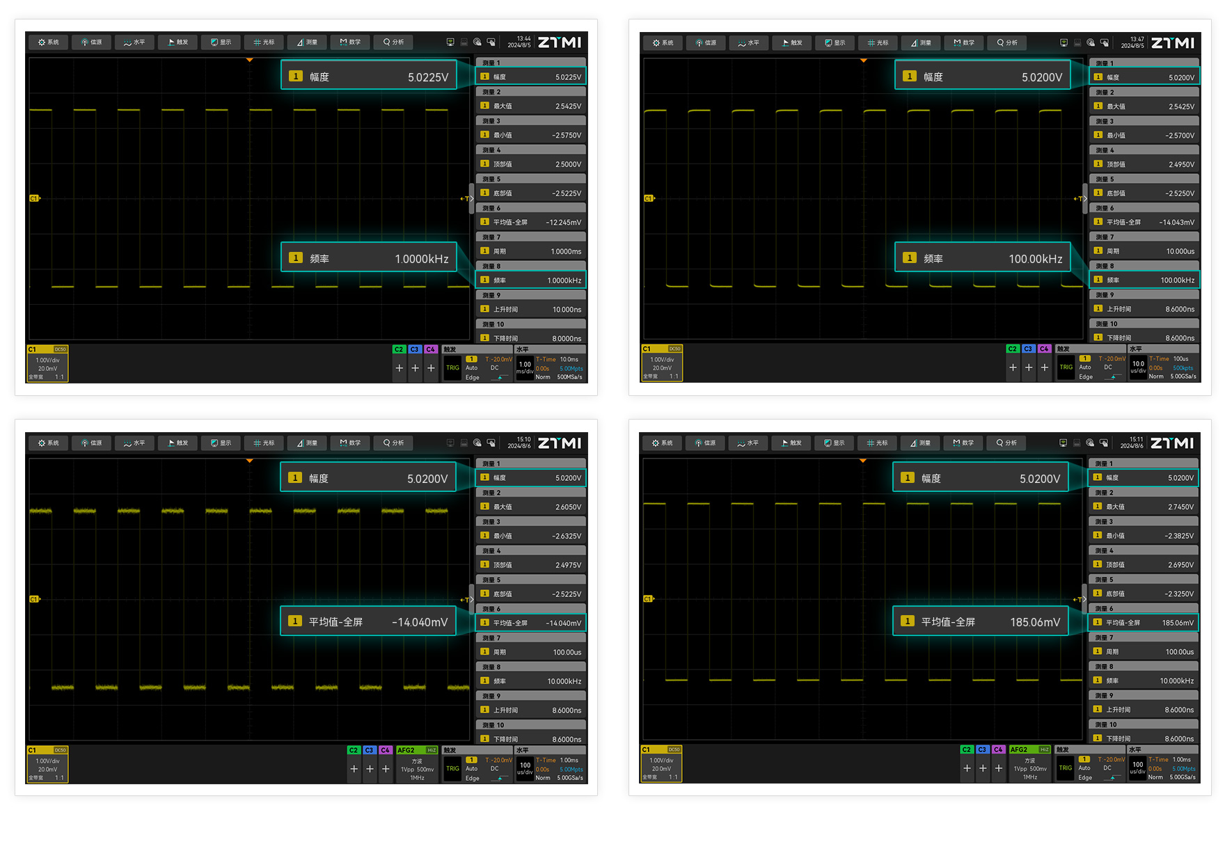 示波器的頻帶衰減曲線在低頻段越平坦,則其測量精度越高。ZUS5000 示波器擁有更平坦的低頻曲線,擁有專利的抗噪算法從而保障在不同頻點、大噪聲、直流偏置等各個工況下測試數據的一致性。