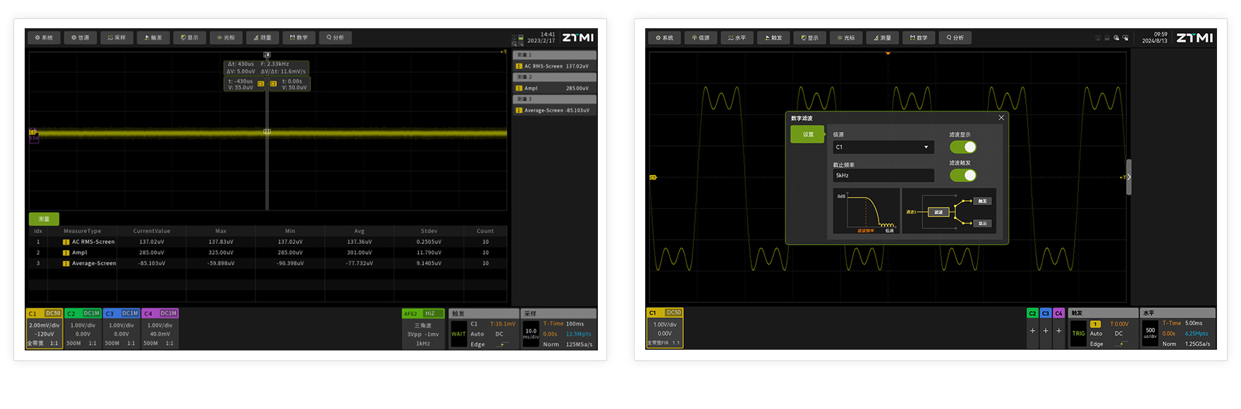 提升示波器ADC采樣位數的同時,需要降低示波器本底噪聲對實測信號的影響。ZUS6000 示波器不僅擁有良好的本底噪聲(50Ω阻抗實測為137μVrms),還提供無級FIR 濾波器,可在10Hz-500MHz 之間設置任意濾波頻點,濾除無效信號。