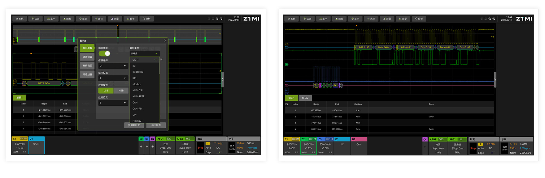 ZUS6000不僅延續了致遠儀器免費協議解碼的傳統,提供了40余種串行通信協議解碼,還創新性的支持了雙解碼功能,可以實現同一時刻,不同協議同時解析,這一實用功能將大大提升了工程師做協議分析的效率。