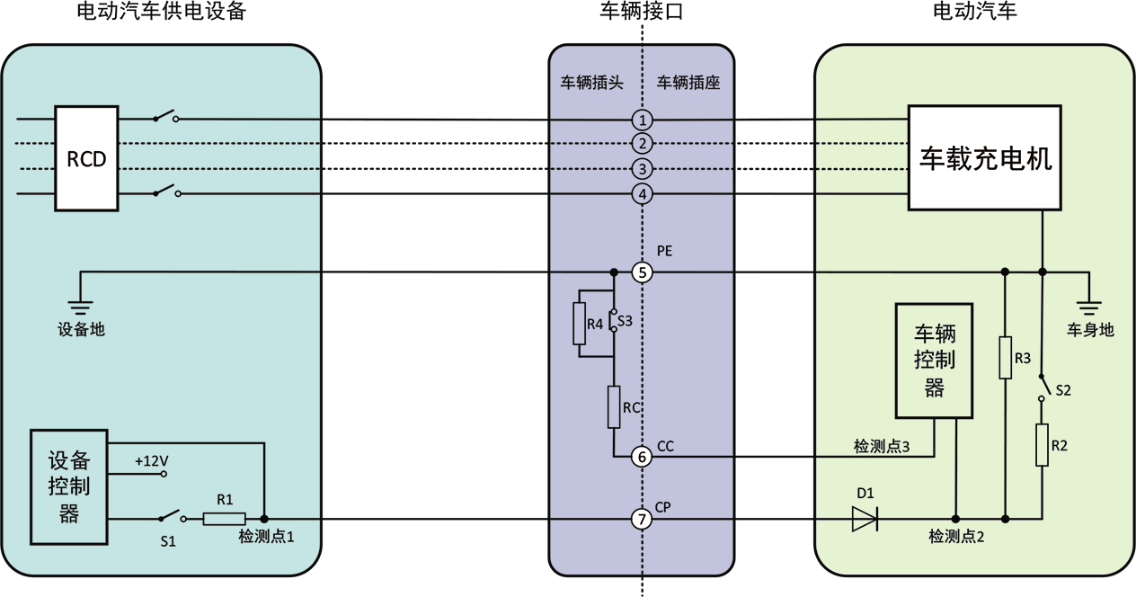 S1一供電設備內部 PWM 信號切換開關; S2一車輛內彭控制導引電路開關; S3一車輛插頭內部常閉開關; RCD可采用與供電設備集成或分立安裝的形式 |