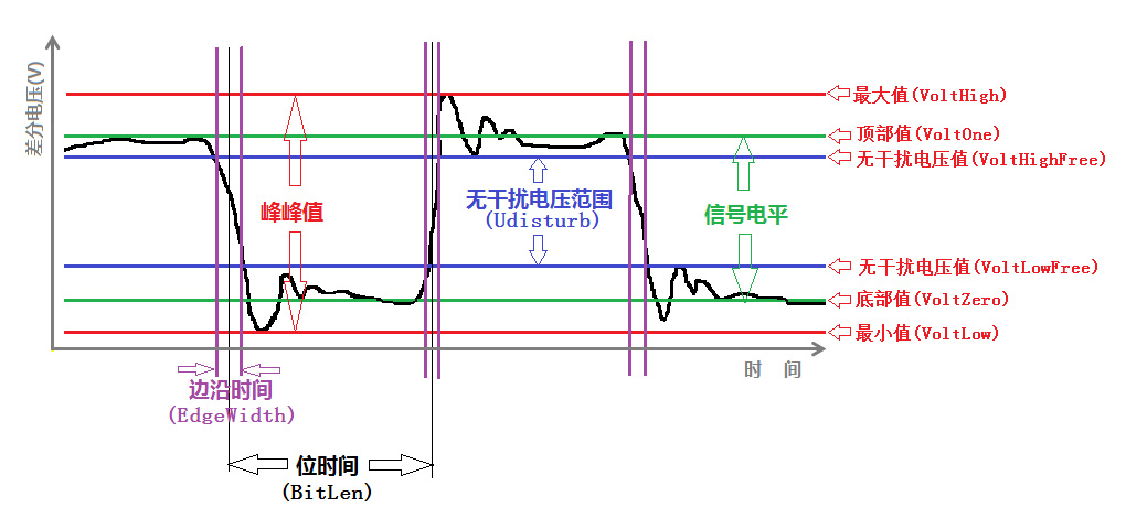 無干擾電壓范圍(Udisturb):是指待評估差分波形段中顯性位電平的最小值和隱性位電平的最大值之間的差值。