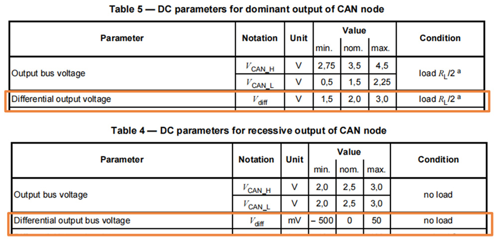 信號質量的好壞與信號的幅值(幅值是指頂部值與底部值之間的差值)密切相關,而CAN差分波形對應的頂部值和底部值應滿足ISO 11898-2標準,否則可能出現CAN通信異常的現象。
