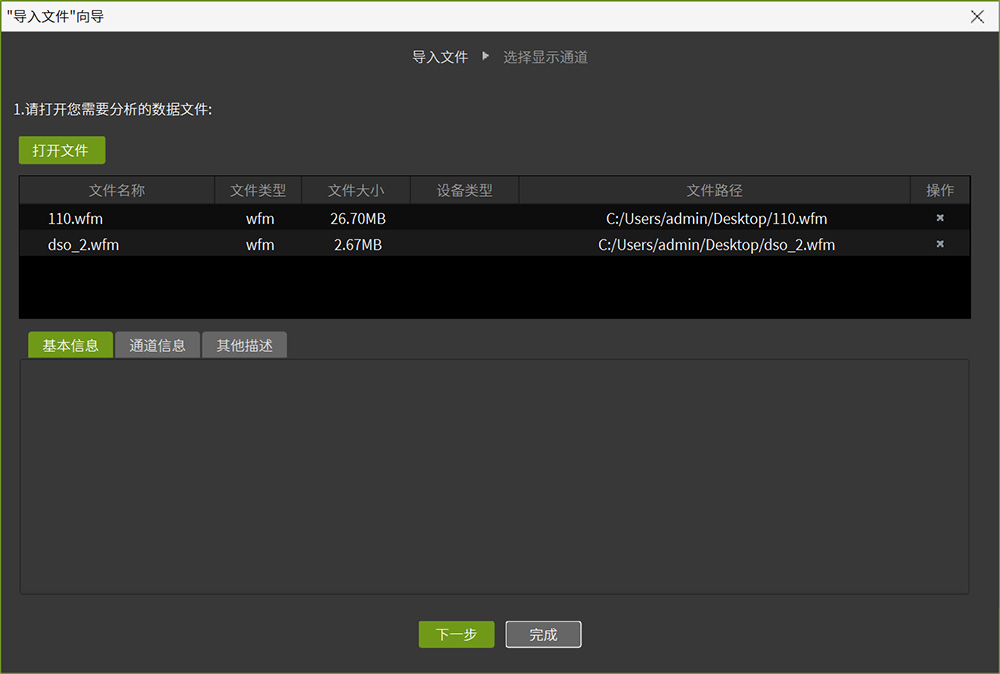 點(diǎn)擊主頁(yè)面"文件分析",或在開(kāi)始菜單中點(diǎn)擊"導(dǎo)入文件",可以打開(kāi)加載文件窗口。選擇加載文件,加載后可對(duì)文件中的信號(hào)源信息進(jìn)行編輯修改,以便更好地進(jìn)行數(shù)據(jù)分析,如圖8、圖9所示。