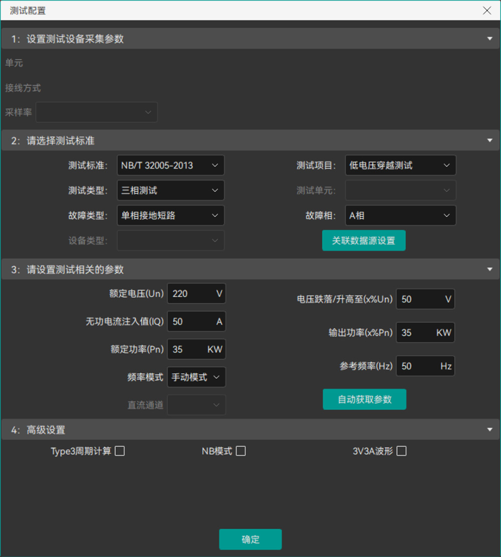 以電壓穿越測(cè)試為例,點(diǎn)擊對(duì)應(yīng)圖標(biāo),打開(kāi)分析界面。在執(zhí)行測(cè)試分析之前,可以通過(guò)必要的參數(shù)配置,確保測(cè)試結(jié)果的有效性,如圖12所示。
