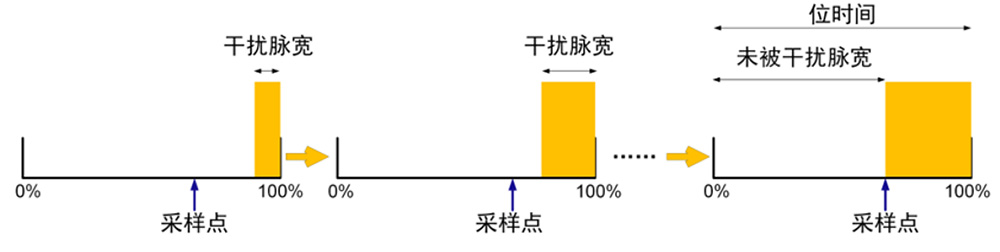 計算采樣點:在錯誤幀波形中,找到被干擾的位。測量該位未被干擾部分的脈寬(T_unaffected),除以整個位時間(T_bit),即可得到采樣點位置: