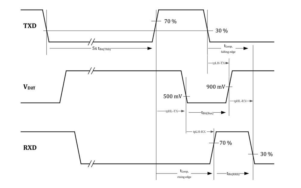 | tLoop | 指TXD到RXD的延遲時間,即收發器的環路延遲時間,包括tLoop1和tLoop2兩個測量項目,前者測量的是TXD下降沿30%處到RXD下降沿30%處的時間,后者測量的是TXD上升沿70%處到RXD上升沿70%處的時間。 |