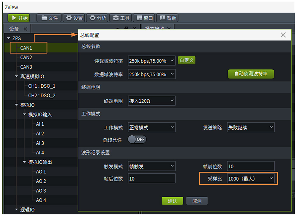 第二步,打開ZView軟件,點開【CAN1】通道參數設置界面,設置波特率、終端電阻及工作模式等。注意,本測試必須將采樣比設置到最大值才能保證測量結果精度;