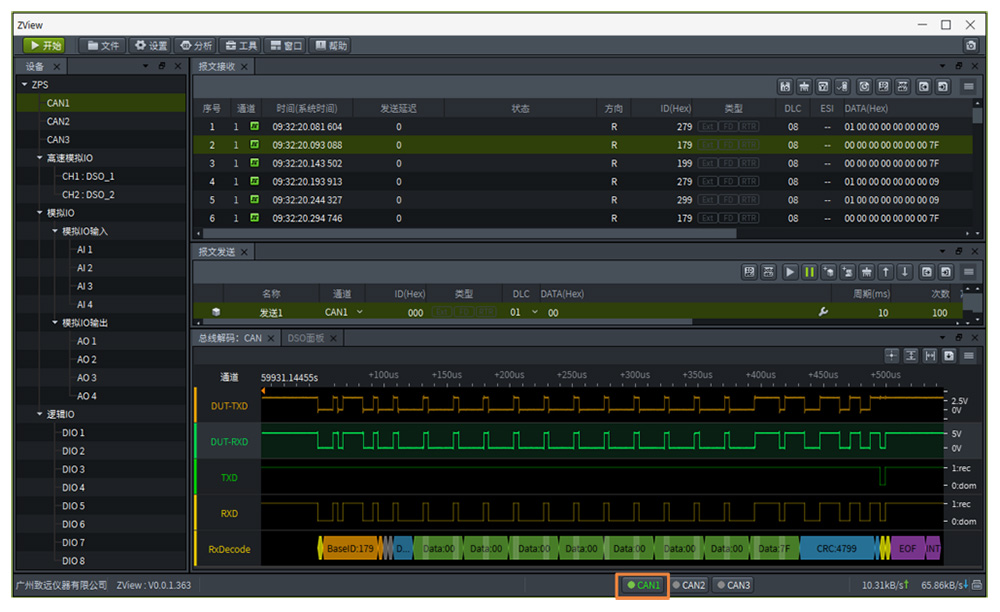 ZPS-CANFD是適用于CANFD、CAN、LIN總線的測量測試儀器,支持總線數據的發送和接收,高層協議解析及診斷,能對CANFD、CAN總線物理層電氣信號實時采集和記錄,并附帶有高速模擬通道、通用數字IO及模擬IO,通過提供的硬件接口及軟件功能,用戶能夠便捷地構建總線信號測量與分析、節點功能仿真及測試、網絡可靠性診斷及評估等。