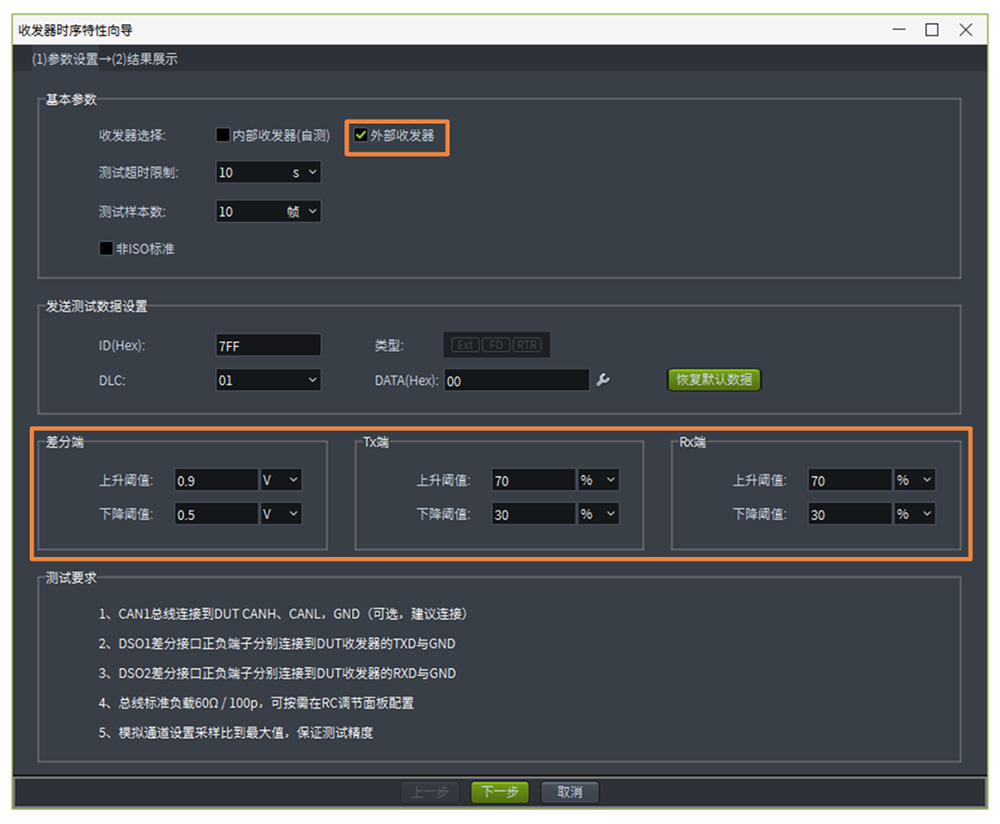 第四步,點擊【分析】菜單,打開【收發器時序特性測量】功能,然后先進行相關參數的設置。例如對DUT的收發器進行時序特性測量時,需要將收發器選擇為"外部收發器",同時TX、RX的上升/下降閾值需根據DUT收發器手冊要求設置,以確保測量結果的準確性;