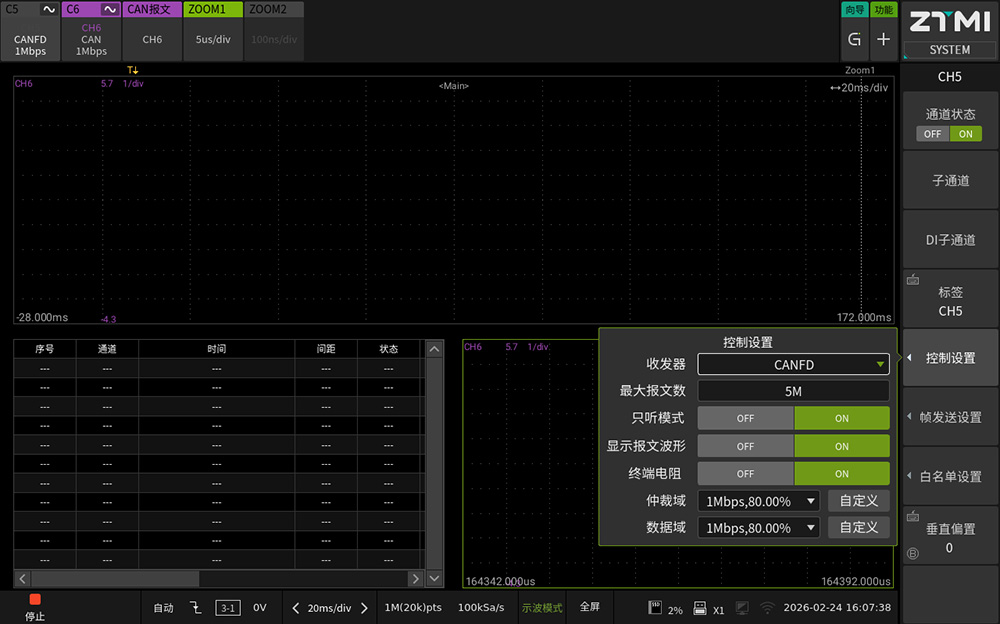 1. 通道設(shè)置:支持設(shè)置CAN/CAN FD收發(fā)器類型、最大報(bào)文數(shù)及只聽模式。針對(duì)CAN FD模式,系統(tǒng)允許用戶精細(xì)化配置仲裁域和數(shù)據(jù)域的波特率及采樣點(diǎn)。
