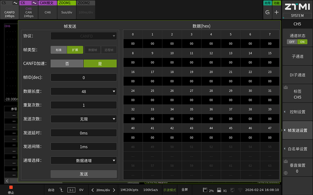 2. 發(fā)送機(jī)制:內(nèi)置幀發(fā)送配置界面,可定義幀ID、數(shù)據(jù)內(nèi)容、發(fā)送次數(shù)、重復(fù)周期及時(shí)間間隔等。通過(guò)在一路配置發(fā)送而另一路配置接收,即可在同一設(shè)備內(nèi)完成閉環(huán)的功能驗(yàn)證。