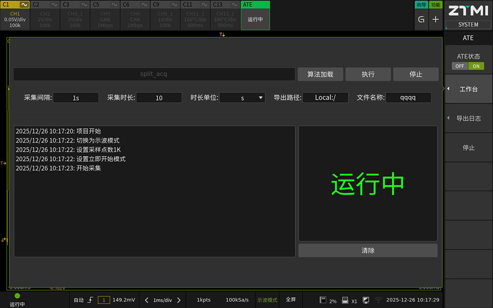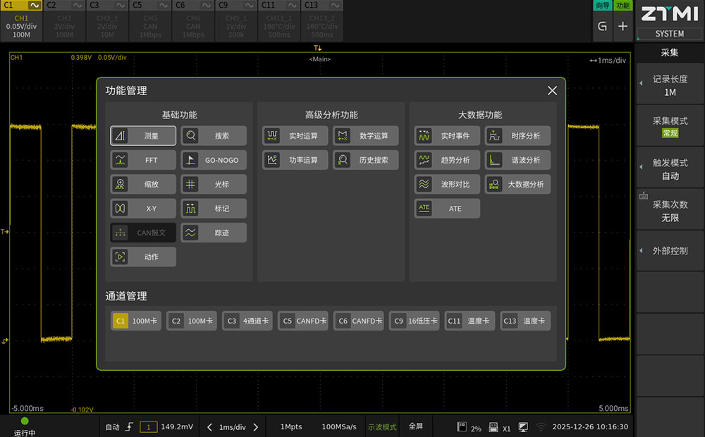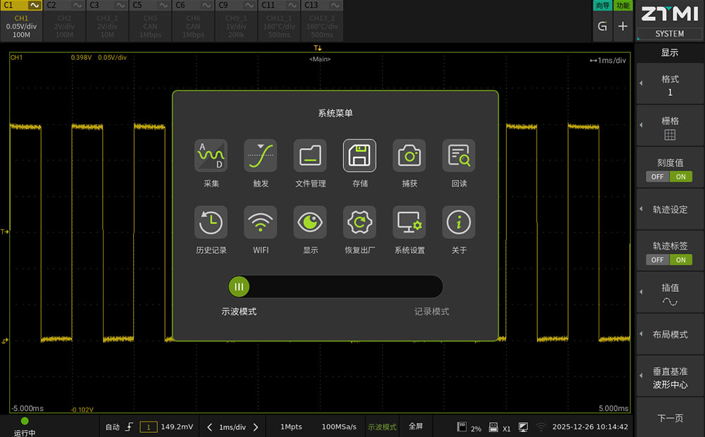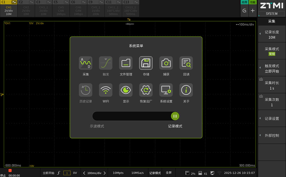 ZDL6000通過(guò)底層軟件架構(gòu)的優(yōu)化,實(shí)現(xiàn)"示波器"與"記錄儀"兩種工作模式的獨(dú)立運(yùn)行。用戶通過(guò)觸屏界面的滑條即可進(jìn)行功能切換,適應(yīng)不同的測(cè)試階段。